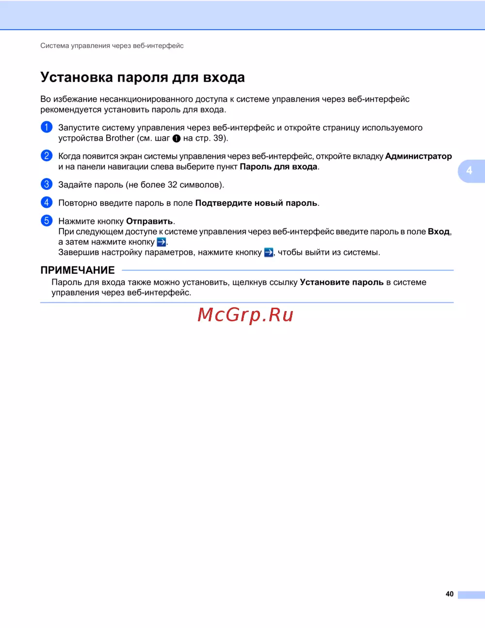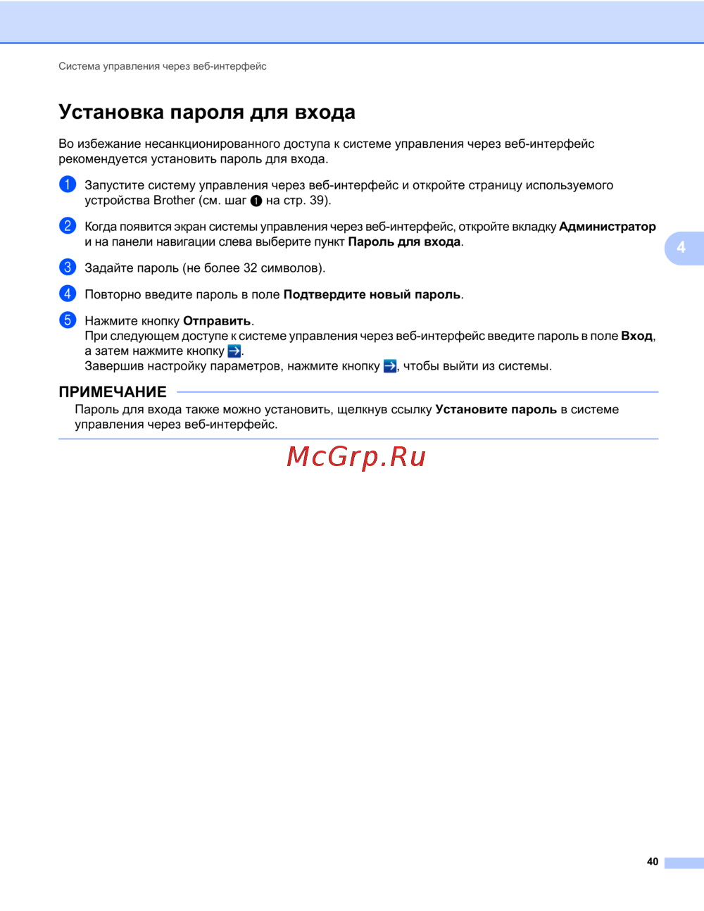 - Настройка пароля для изменения параметров устройства с помощью жк дисплея устройства brother p.114