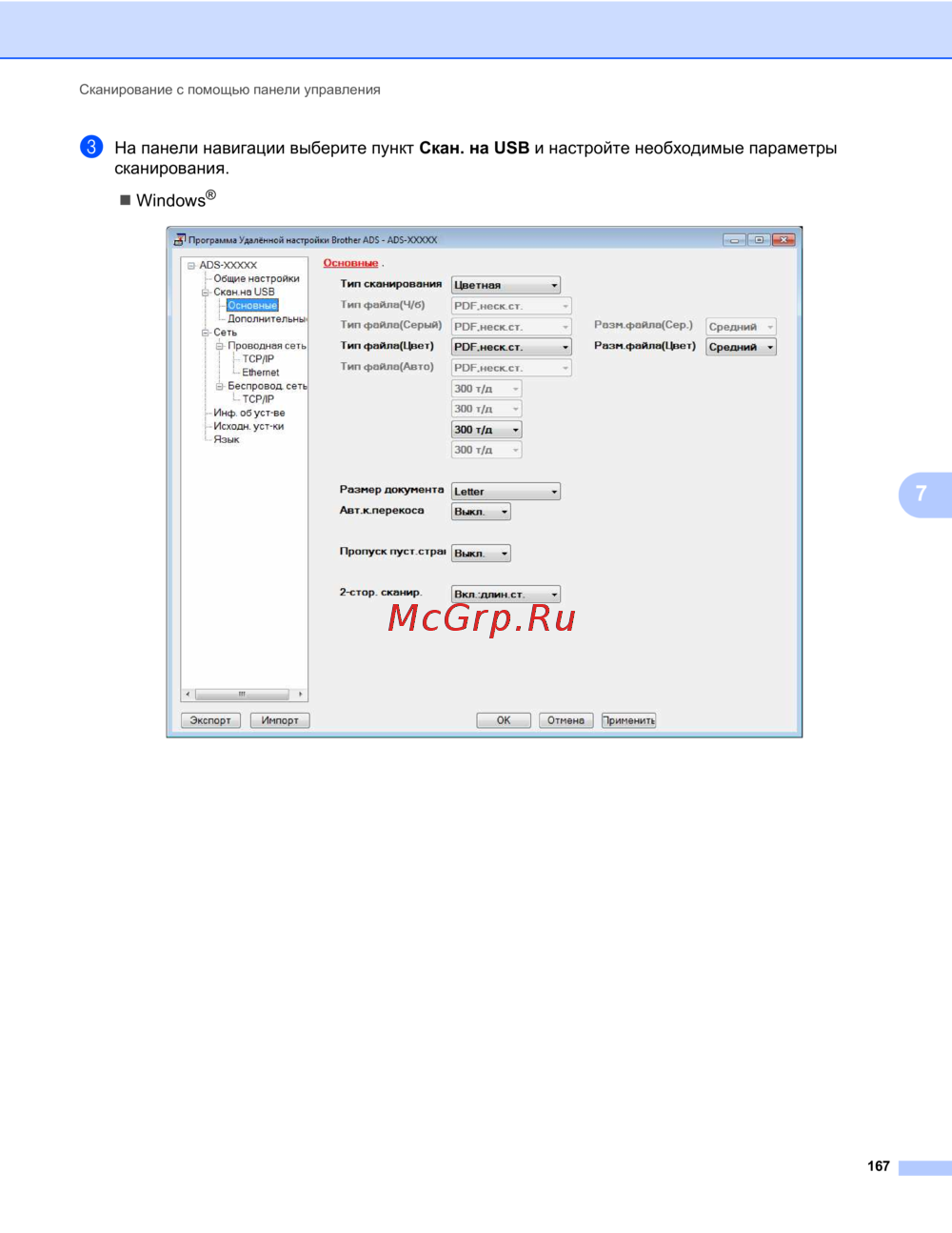 - При использовании для сканирования панели управления устройства brother и компьютера p.332