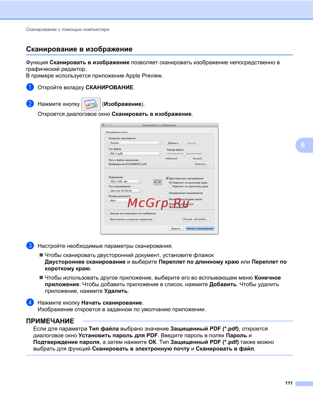 - При использовании для сканирования панели управления устройства brother и компьютера p.332