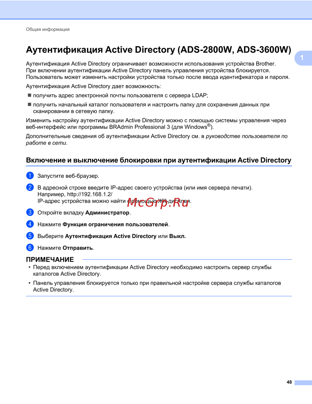 Аутентификация Active Directory ограничивает возможности использования устройства Brother.