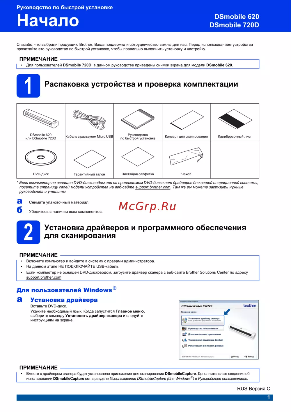 Brother DS-620 — руководство по быстрой установке сканеров: шаги и советы [1/8]