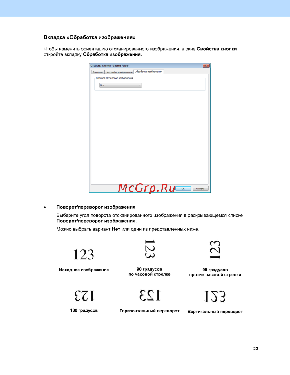 - Чтобы изменить ориентацию отсканированного изображения в окне свойства кнопки откройте вкладку обработка изображения p.26