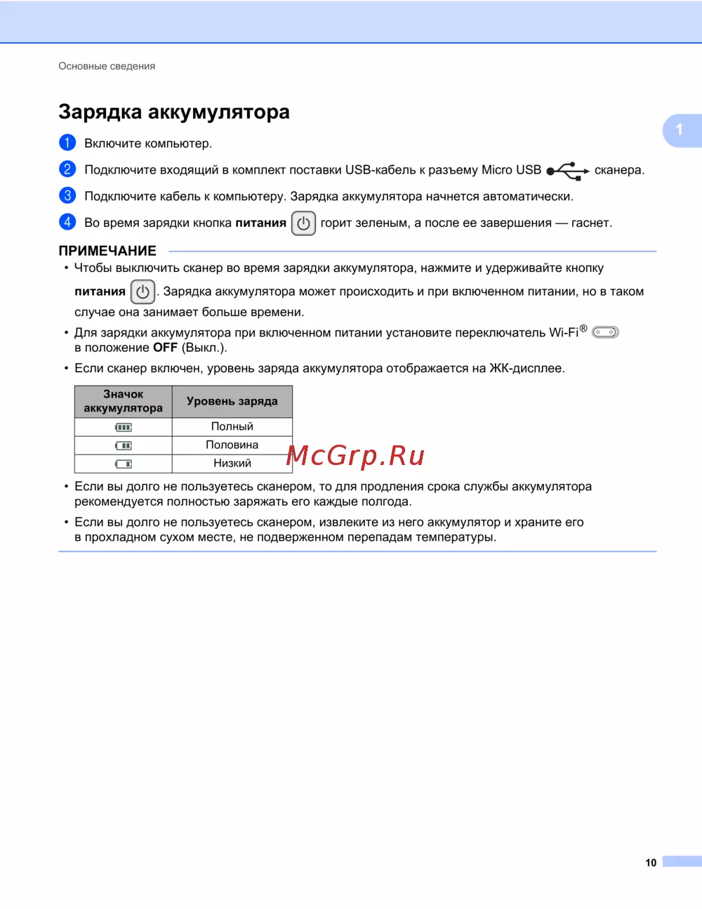 • Если вы долго не пользуетесь сканером, то для продления срока службы аккумулятора