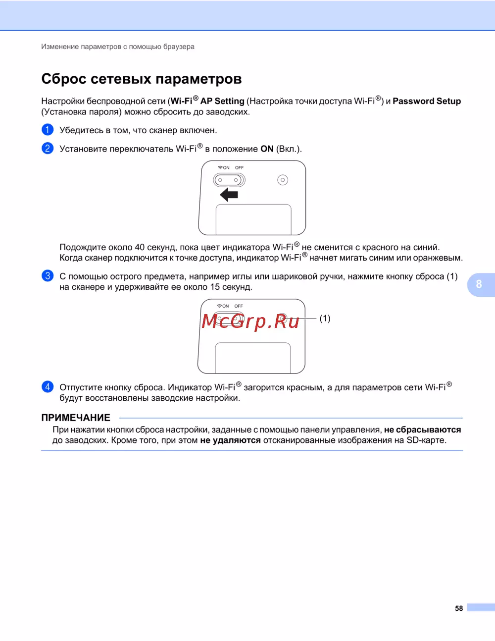 до заводских. Кроме того, при этом не удаляются отсканированные изображения на SD-карте.