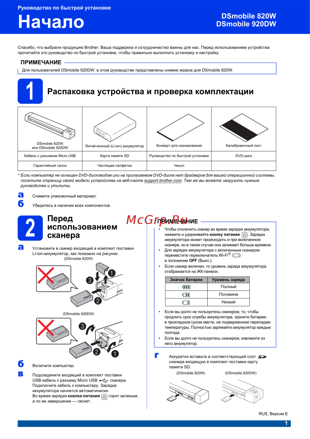 Brother DS-920DW — руководство по быстрой установке сканера: шаги и советы [1/10]