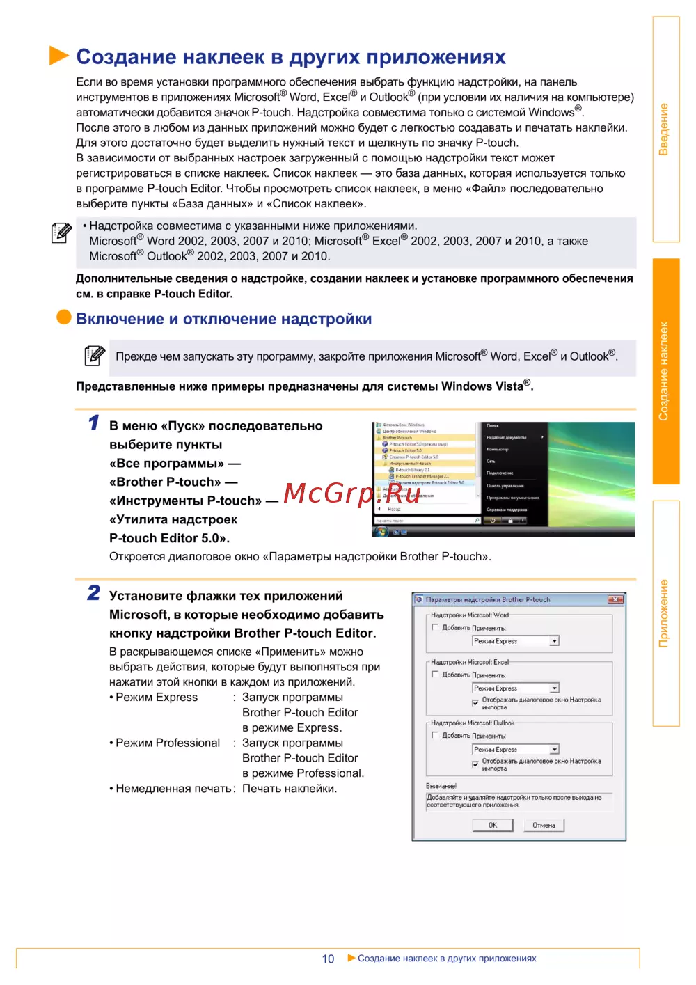 - Установите флажки тех приложений microsoft в которые необходимо добавить кнопку надстройки brother p touch editor p.10