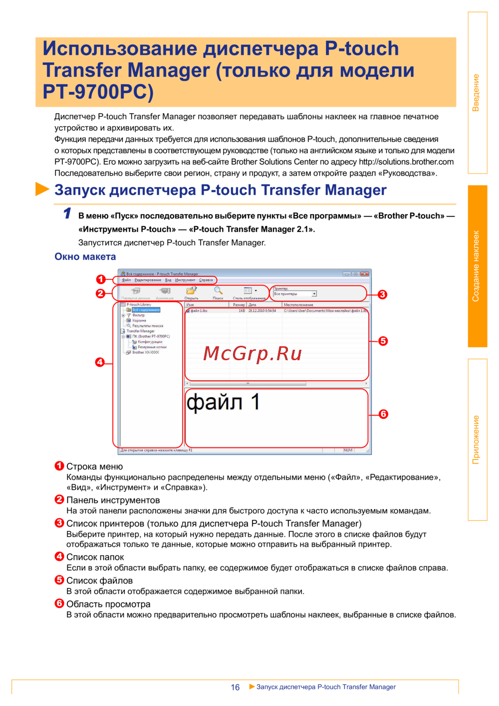 - Использование диспетчера p touch transfer manager только для модели pt 9700pc p.16