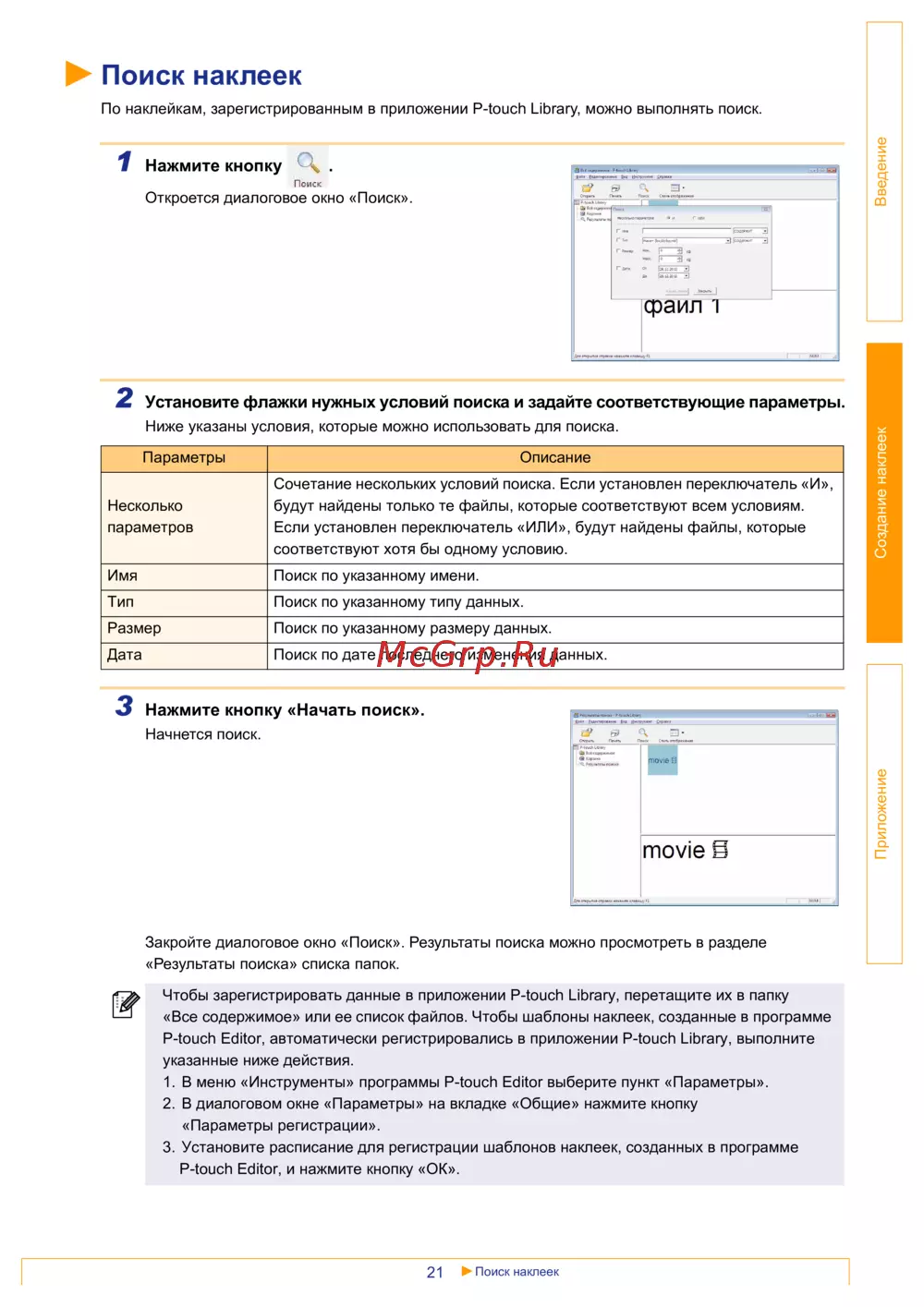 По наклейкам, зарегистрированным в приложении P-touch Library, можно выполнять поиск.