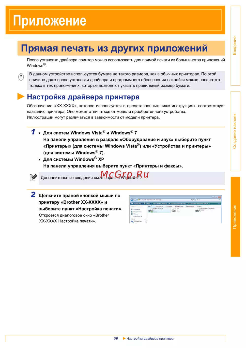 - Щелкните правой кнопкой мыши по принтеру brother xx xxxx и выберите пункт настройка печати p.25