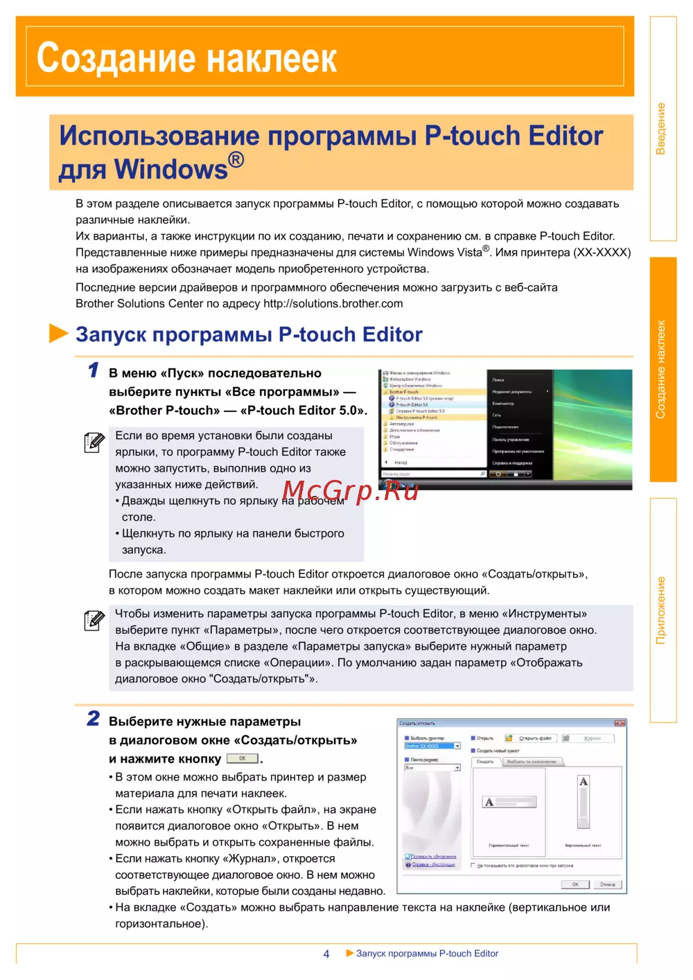 В этом разделе описывается запуск программы P-touch Editor, с помощью которой можно создавать