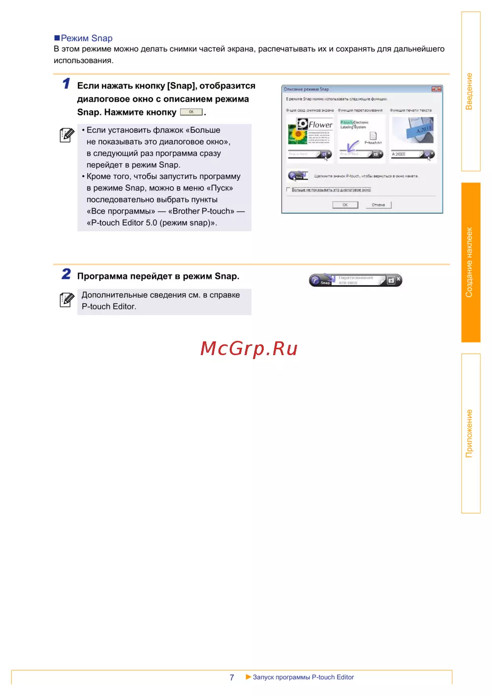 - Если нажать кнопку snap отобразится диалоговое окно с описанием режима snap нажмите кнопку p.7