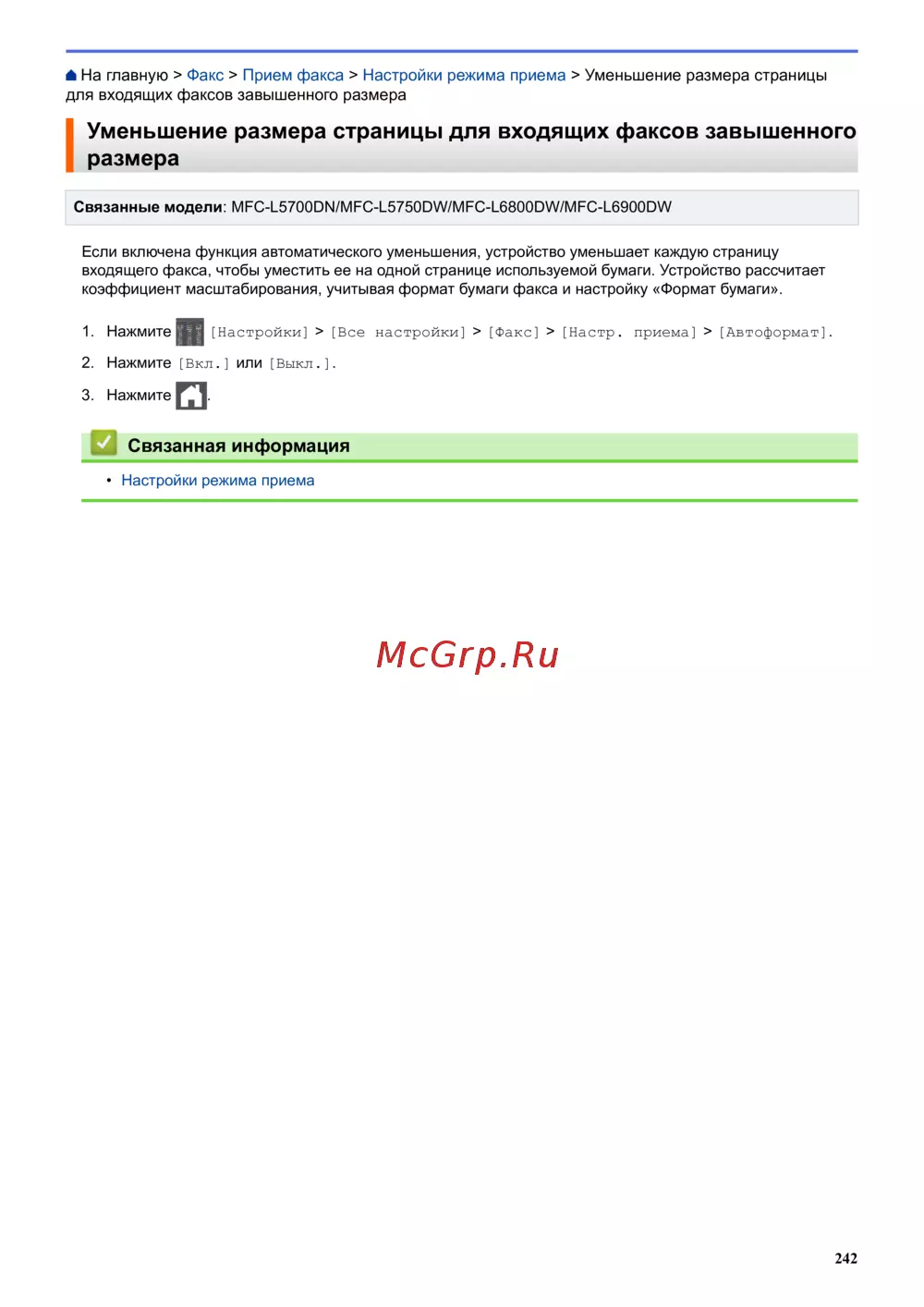 На главную > Факс > Прием факса > Настройки режима приема > Уменьшение размера страницы