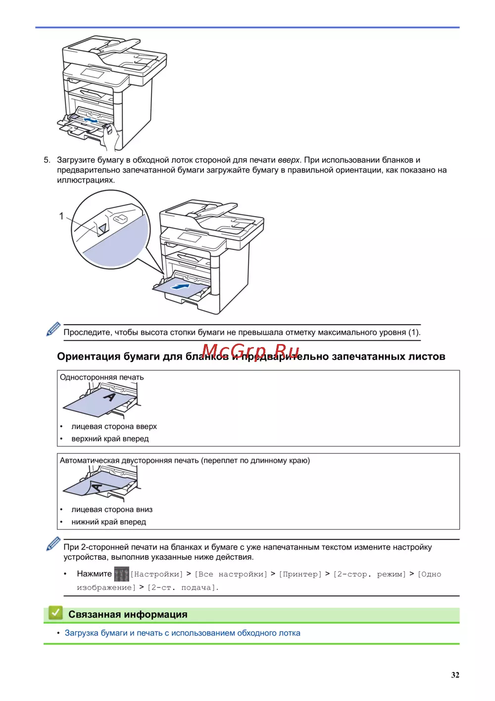 - Ориентация бумаги для бланков и бумаги с уже напечатанным текстом p.32