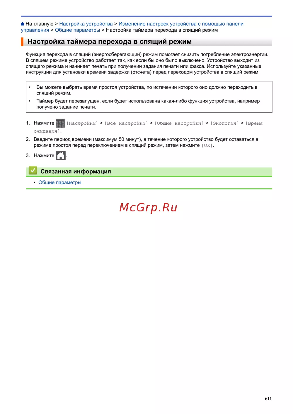 1. Нажмите [Настройки] > [Все настройки] > [Общие настройки] > [Экология] > [Время