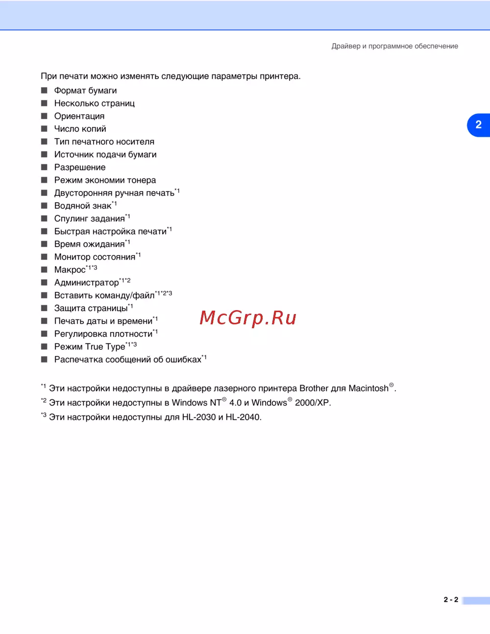 Эти настройки недоступны для HL-2030 и HL-2040.