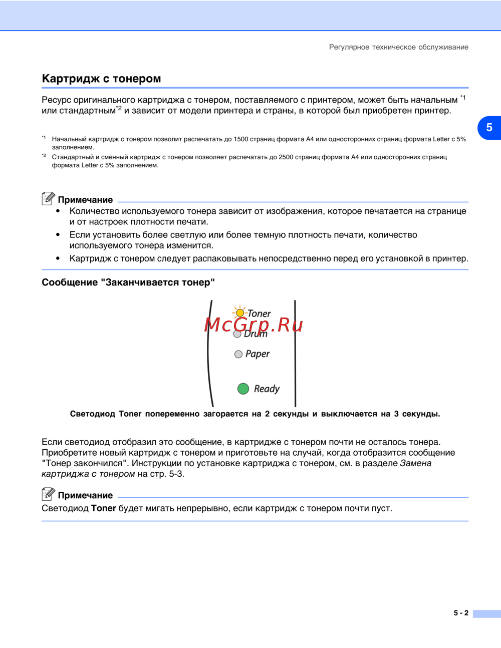 Светодиод Toner попеременно загорается на 2 секунды и выключается на 3 секунды.