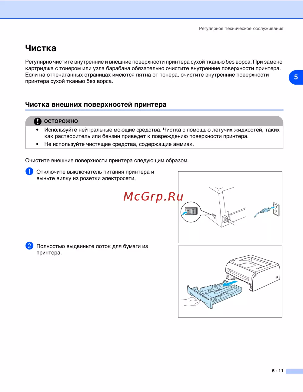 Регулярно чистите внутренние и внешние поверхности принтера сухой тканью без ворса. При замене