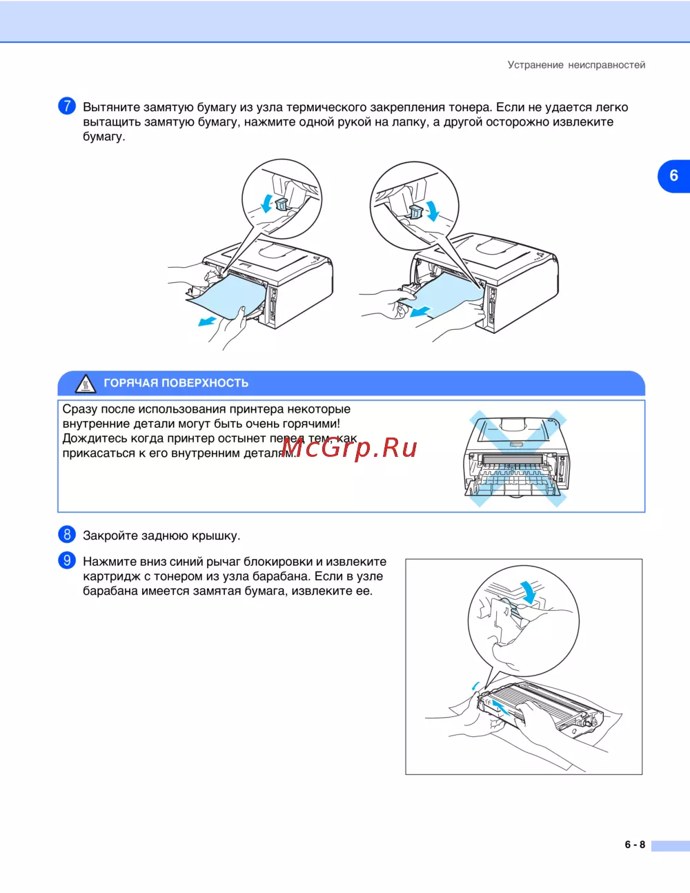 - Сразу после использования принтера некоторые внутренние детали могут быть очень горячими дождитесь когда принтер остынет перед тем как прикасаться к его внутренним деталям p.69