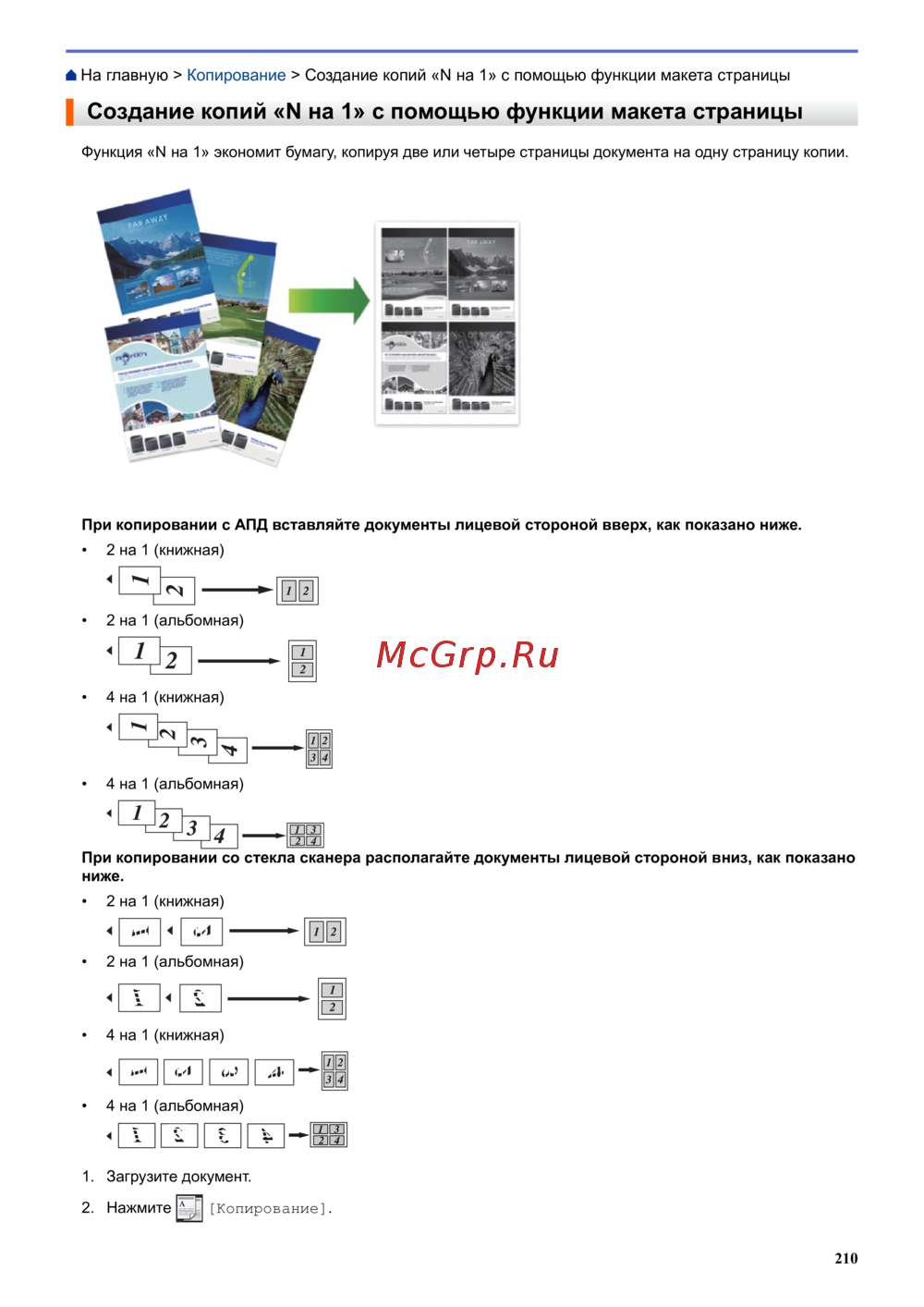 На главную > Копирование > Создание копий «N на 1» с помощью функции макета страницы