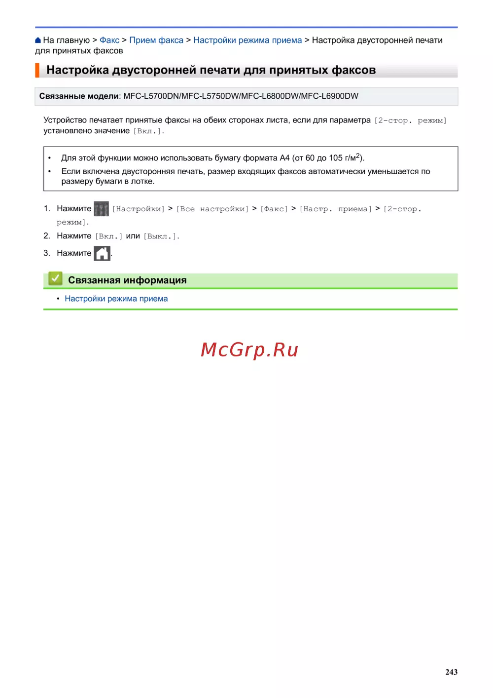 На главную > Факс > Прием факса > Настройки режима приема > Настройка двусторонней печати