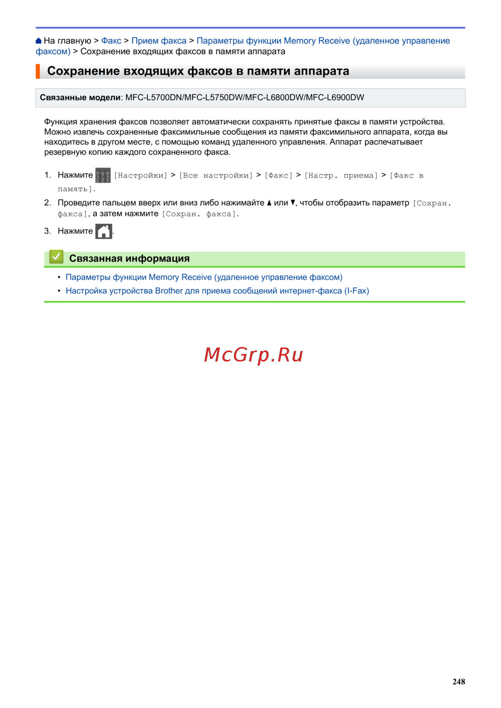 Brother MFC-L6900DW [255/733] Сохранение входящих факсов в памяти аппарата