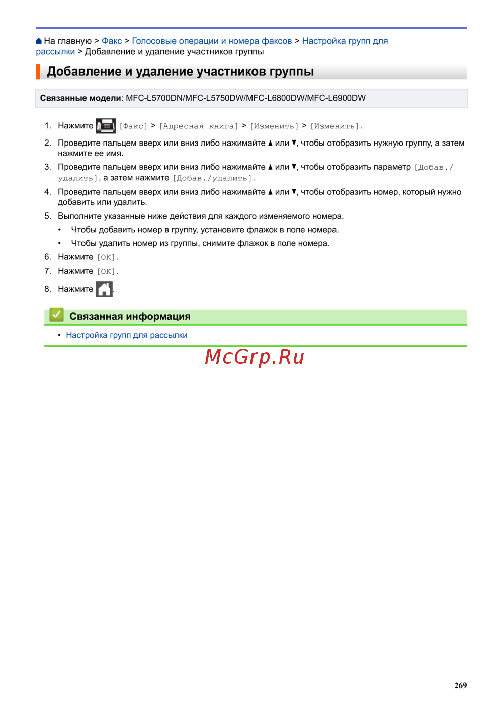 Brother MFC-L6900DW — настройка групп для рассылки факсов: добавление и удаление участников [276/733]