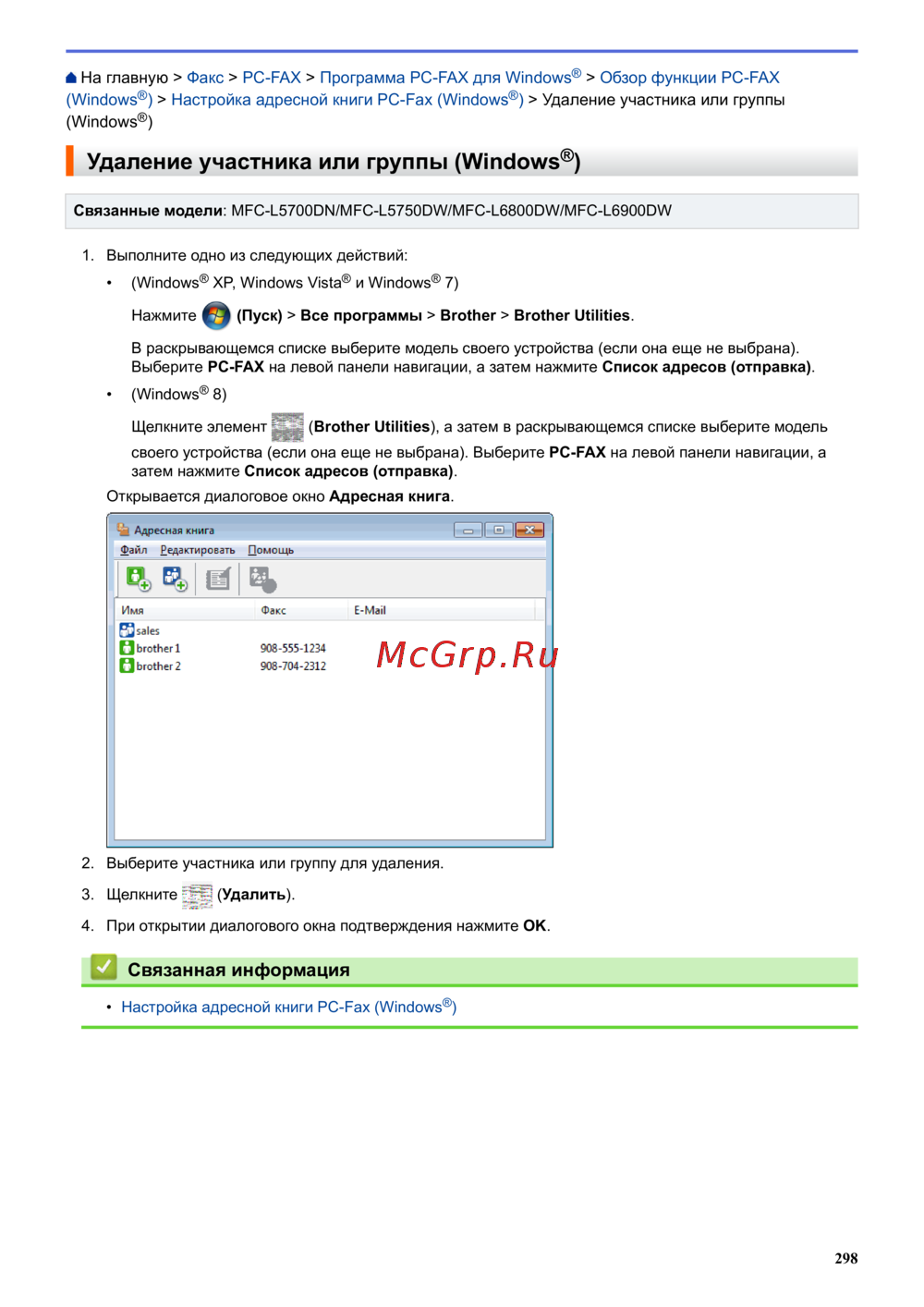 Brother MFC-L6900DW — настройка и удаление участников в программе PC-FAX для Windows [305/733]