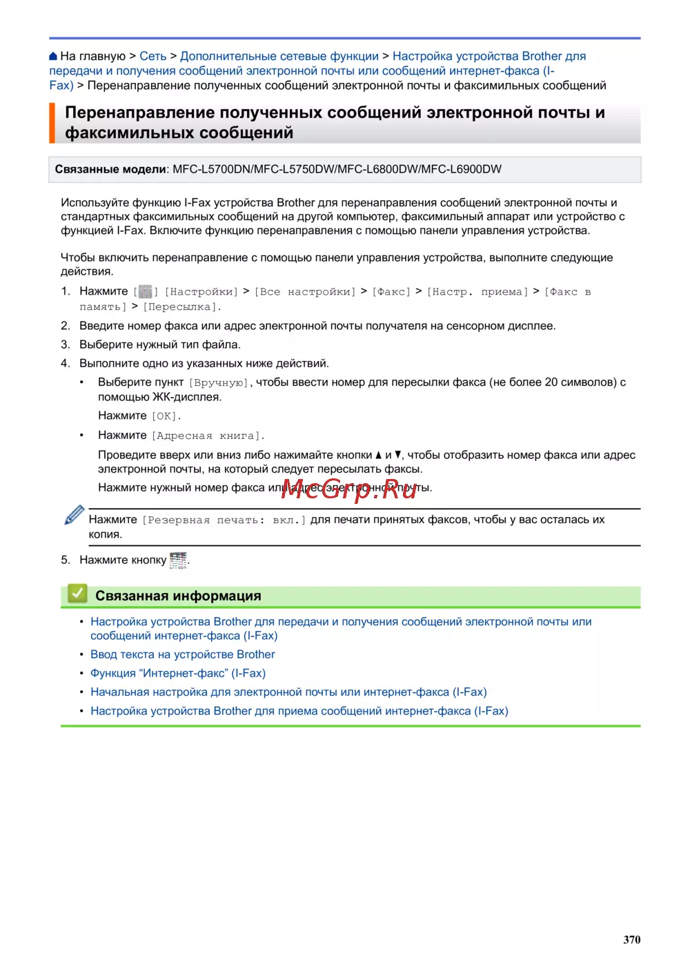 Используйте функцию I-Fax устройства Brother для перенаправления сообщений электронной почты и
