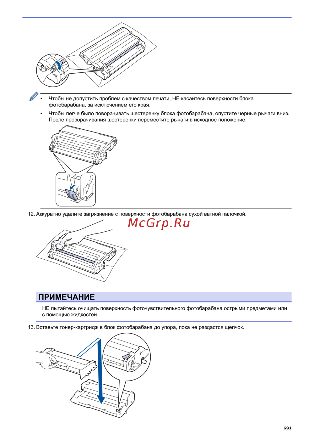 НЕ пытайтесь очищать поверхность фоточувствительного фотобарабана острыми предметами или