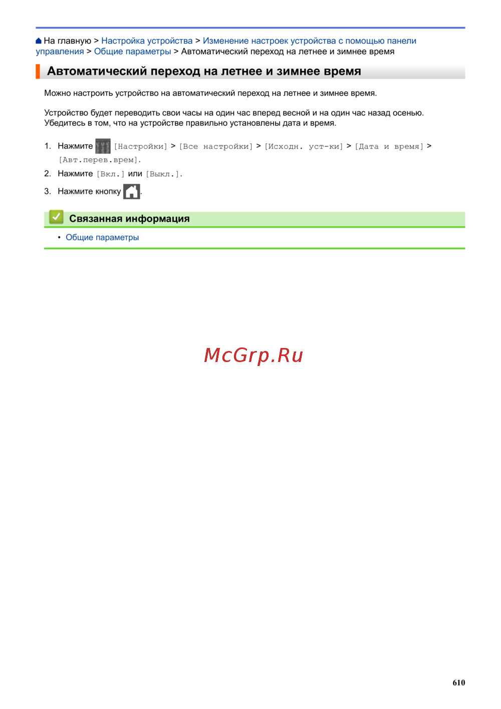 управления > Общие параметры > Автоматический переход на летнее и зимнее время