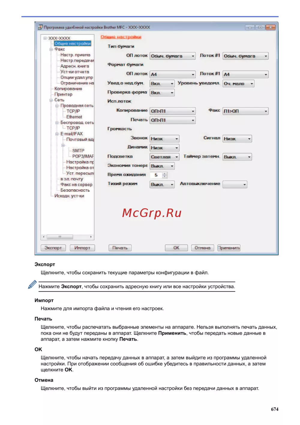 Нажмите Экспорт, чтобы сохранить адресную книгу или все настройки устройства.