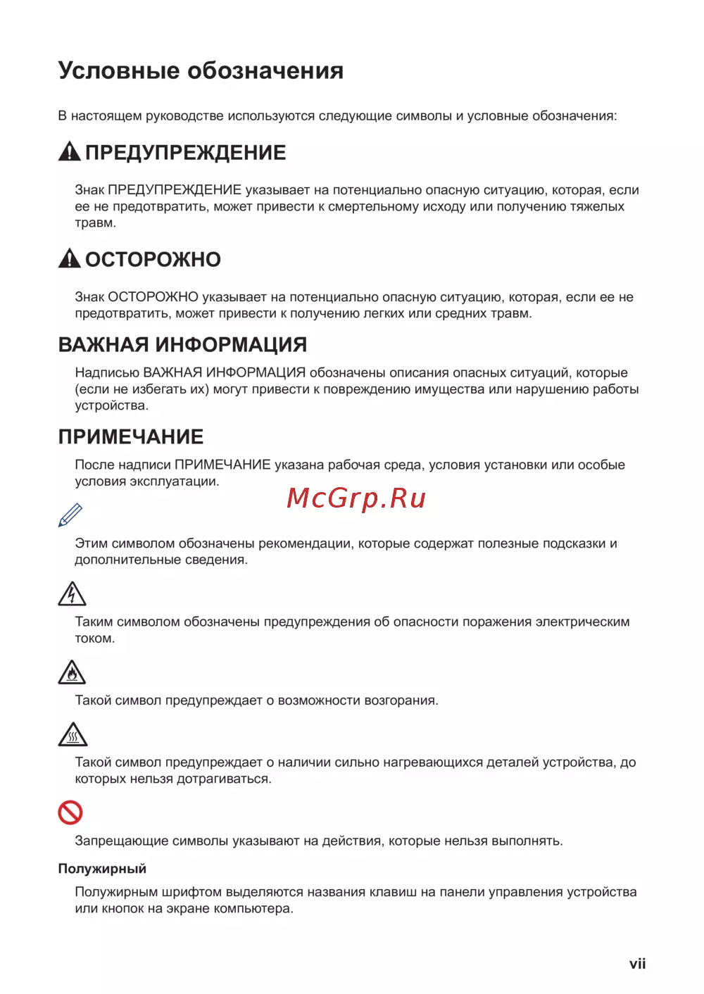 Изучите важные условные обозначения и предупреждения, используемые в руководстве. Узнайте о потенциальных опасностях и рекомендациях для безопасной эксплуатации.