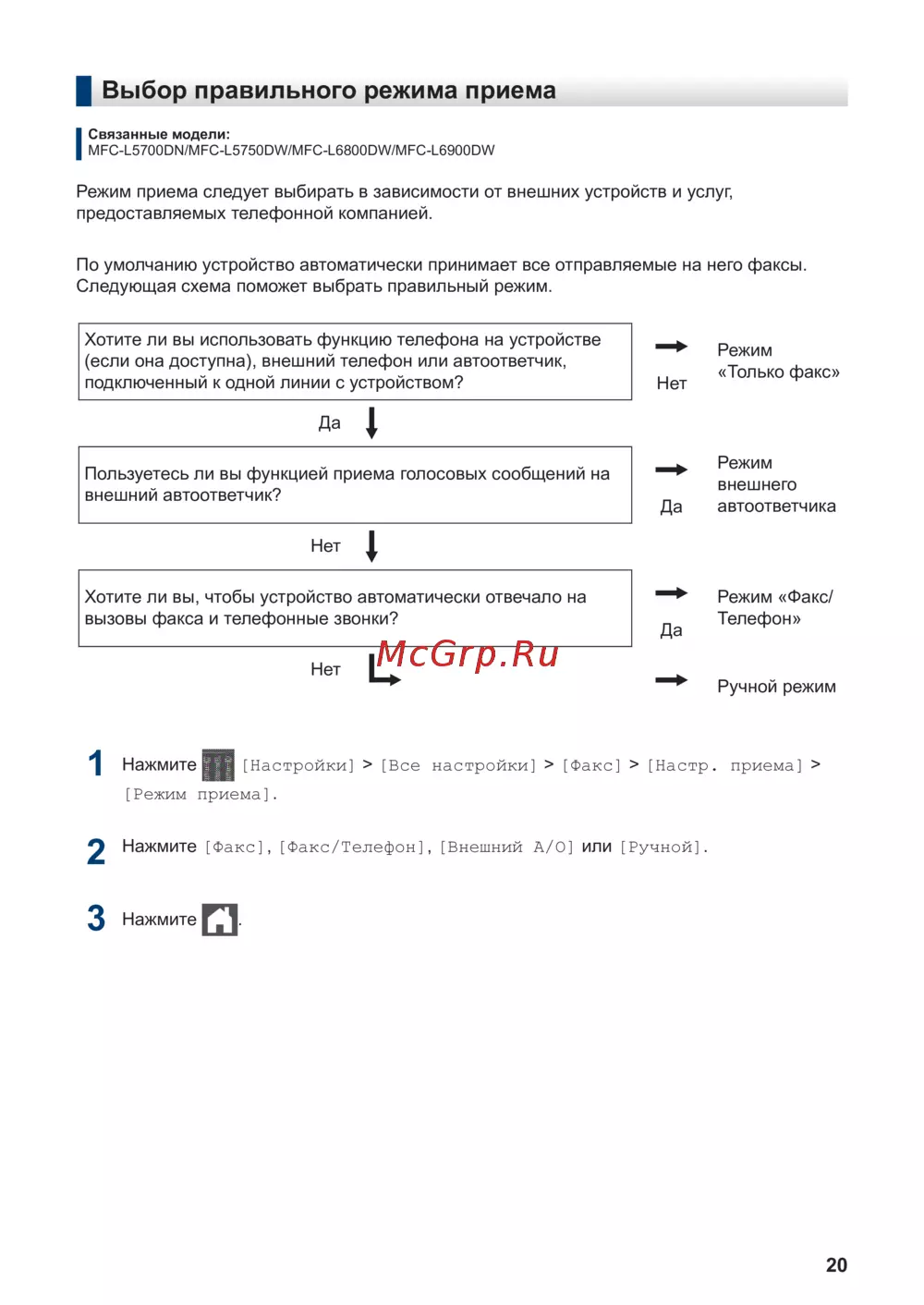 ![Brother MFC-L5750DW [21/35] Выбор правильного режима приема](/views2/1250905/page21/bg15.png)