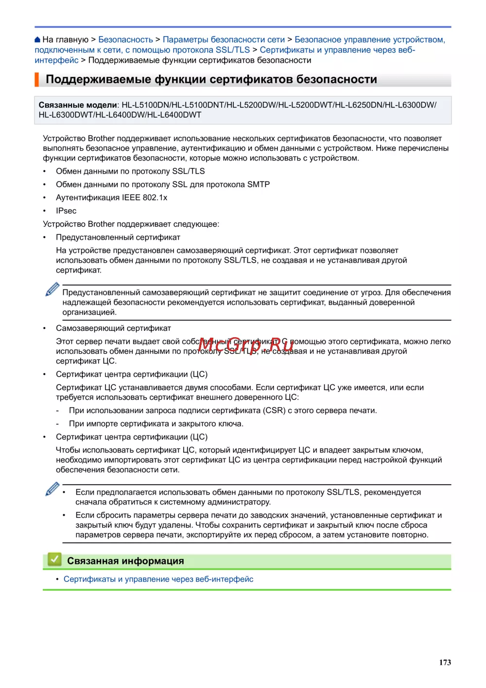 Устройство Brother поддерживает использование нескольких сертификатов безопасности, что позволяет