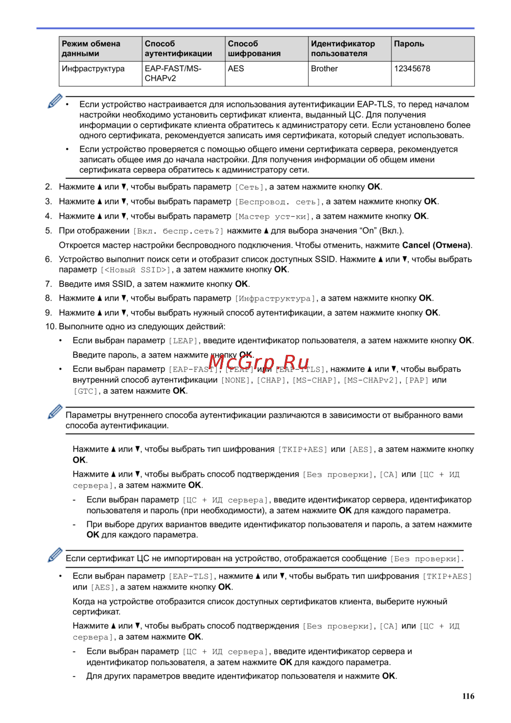 • Если устройство настраивается для использования аутентификации EAP-TLS, то перед началом