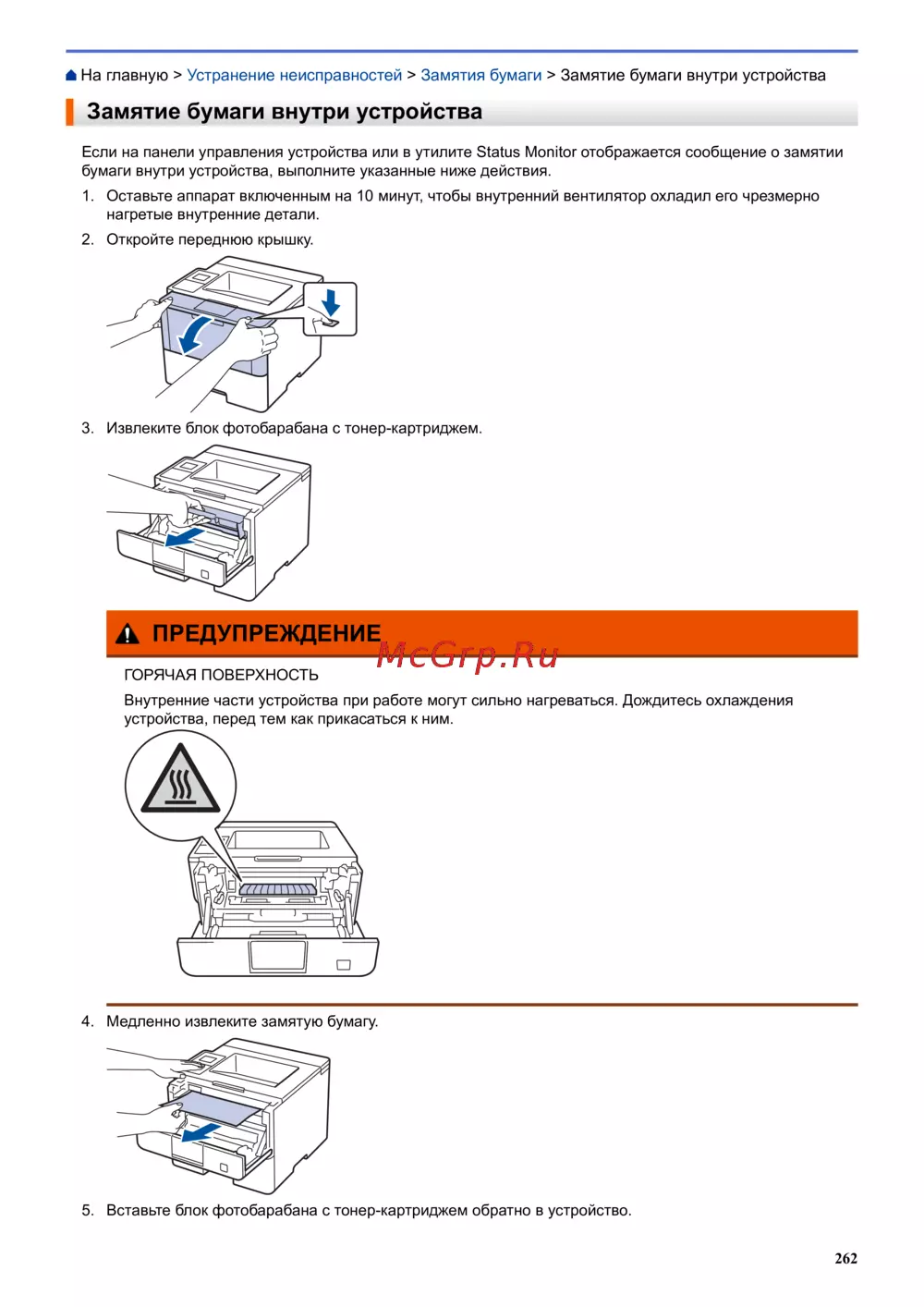 Внутренние части устройства при работе могут сильно нагреваться. Дождитесь охлаждения