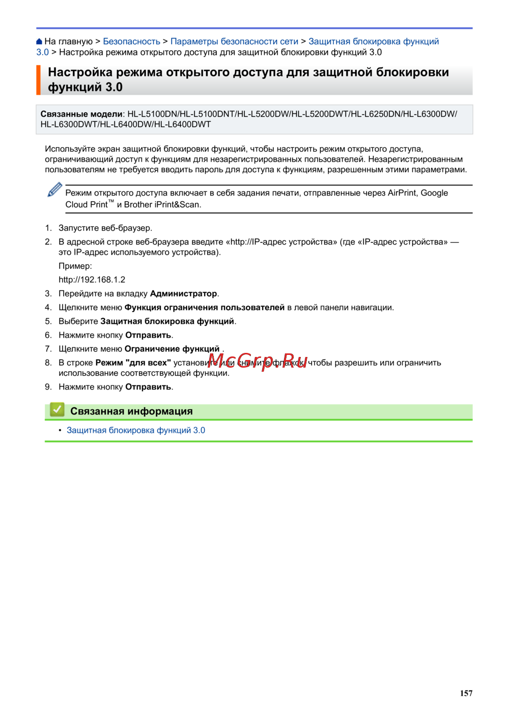 Brother HL-L6250DN [162/407] Настройка режима открытого доступа для защитной блокировки функций 3