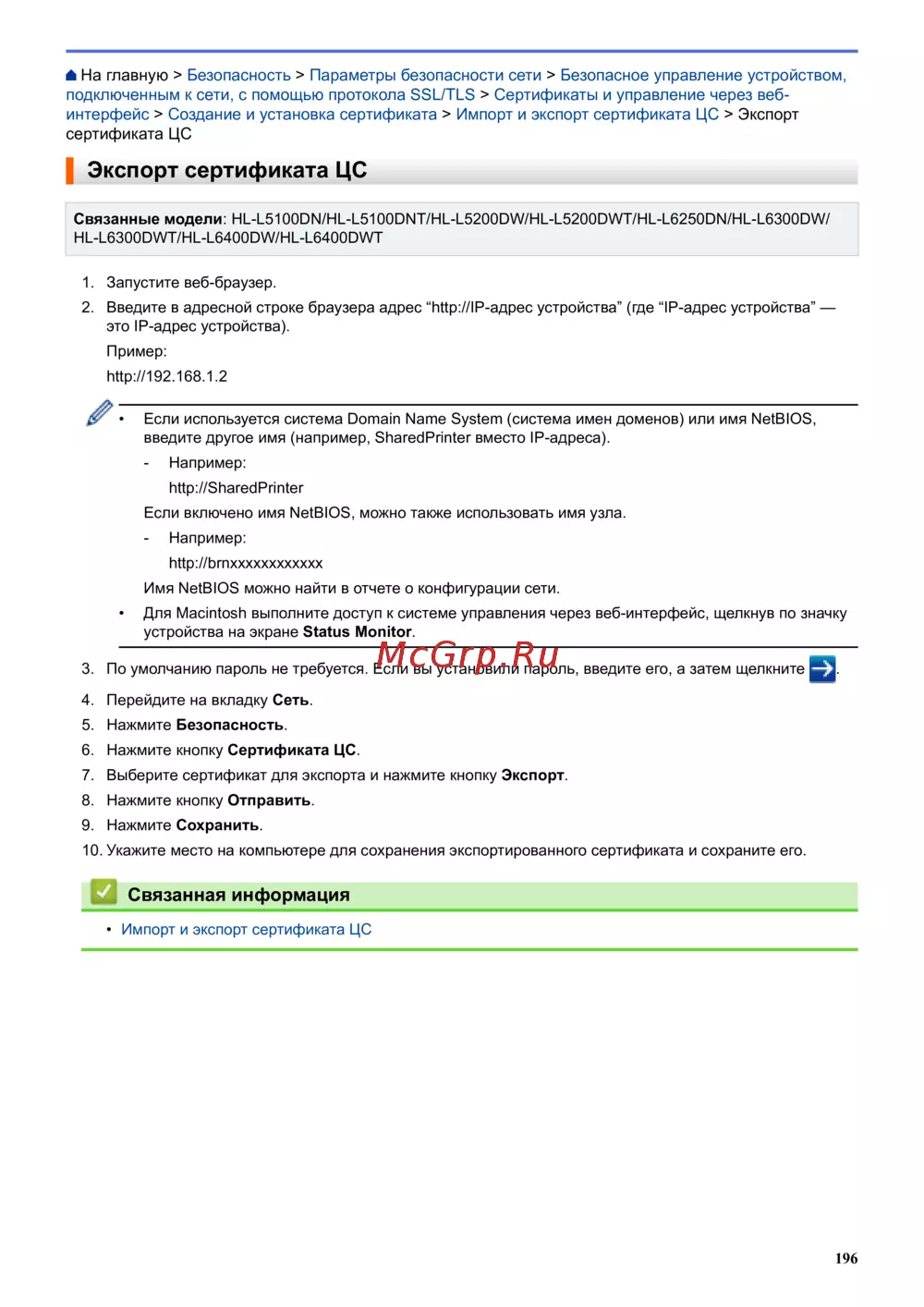 Brother HL-L6250DN [201/407] Экспорт сертификата цс