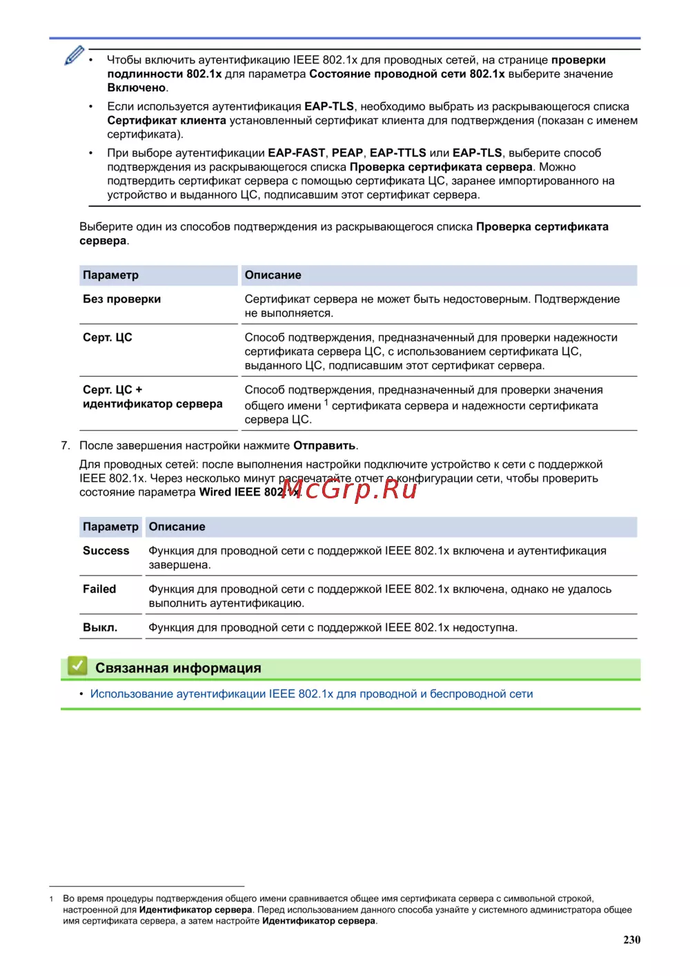 IEEE 802.1x. Через несколько минут распечатайте отчет о конфигурации сети, чтобы проверить