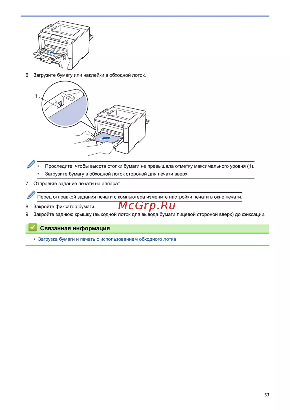 - Загрузка бумаги и печать с использованием обходного лотка p.34