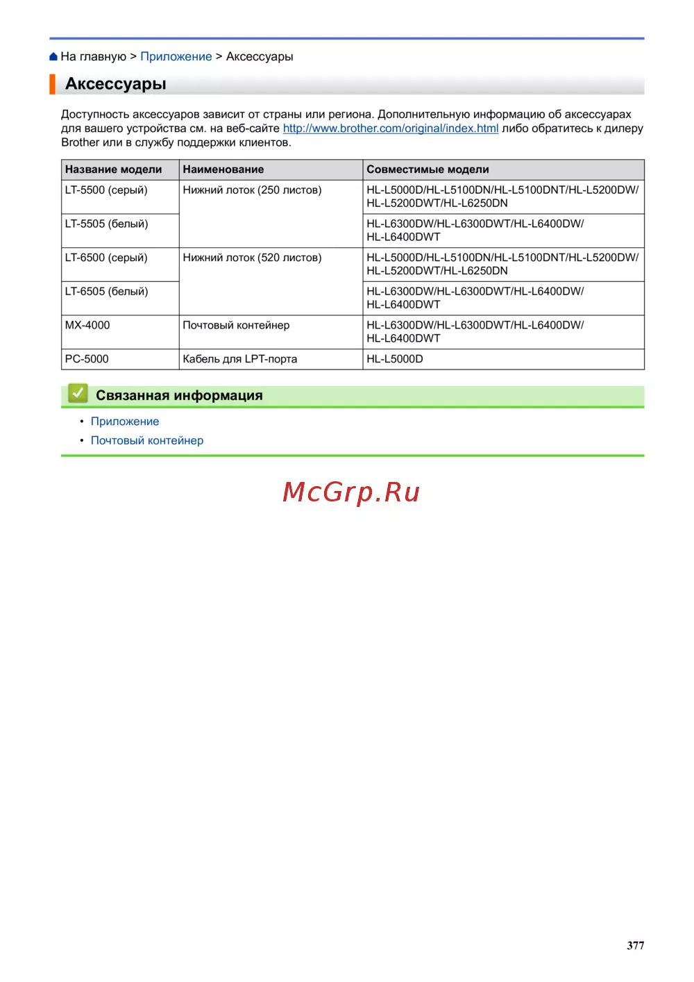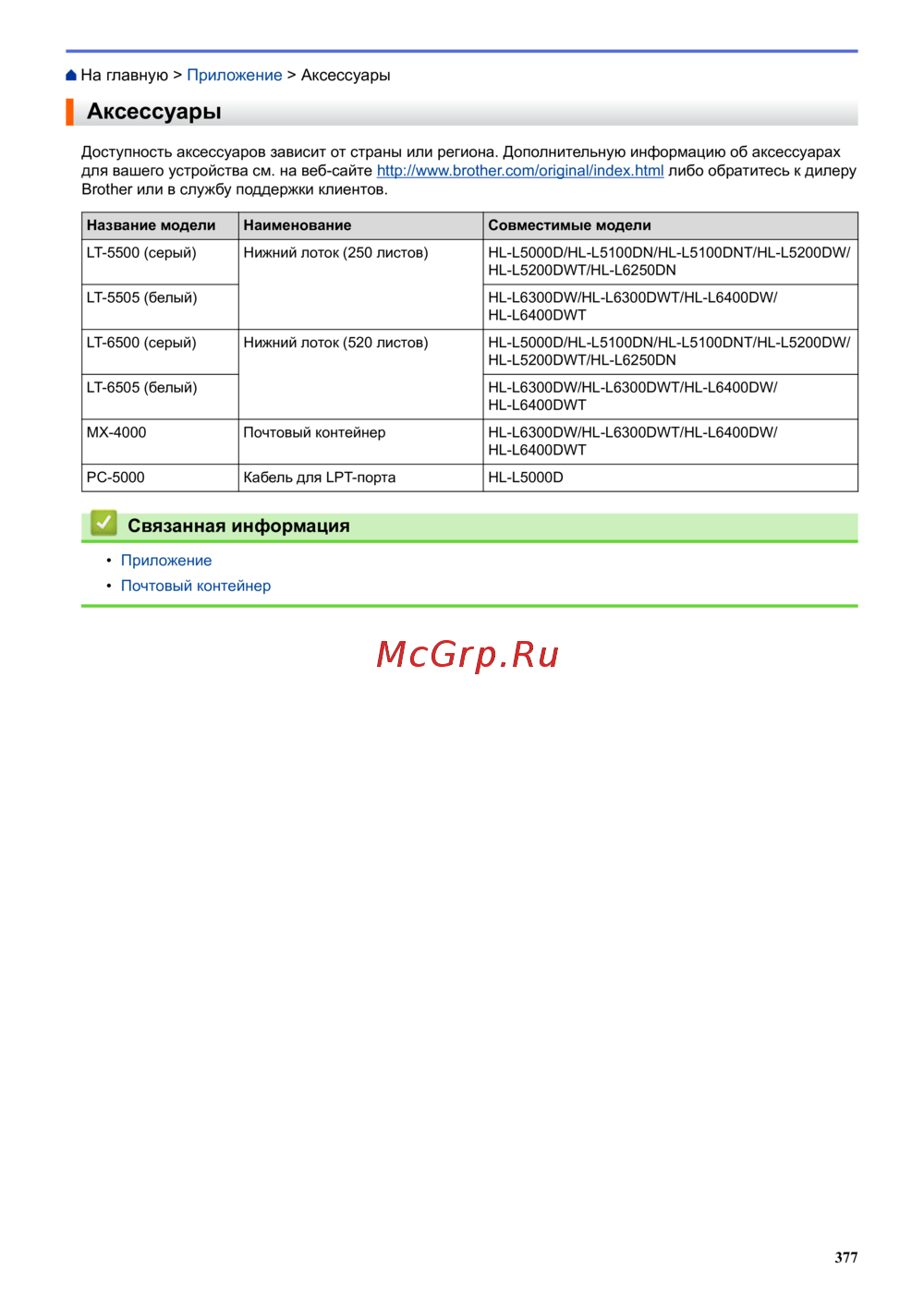 - Доступность аксессуаров зависит от страны или региона дополнительную информацию об аксессуарах для вашего устройства см на веб сайте http www brother com original index html либо обратитесь к дилеру brother или в службу поддержки клиентов p.382