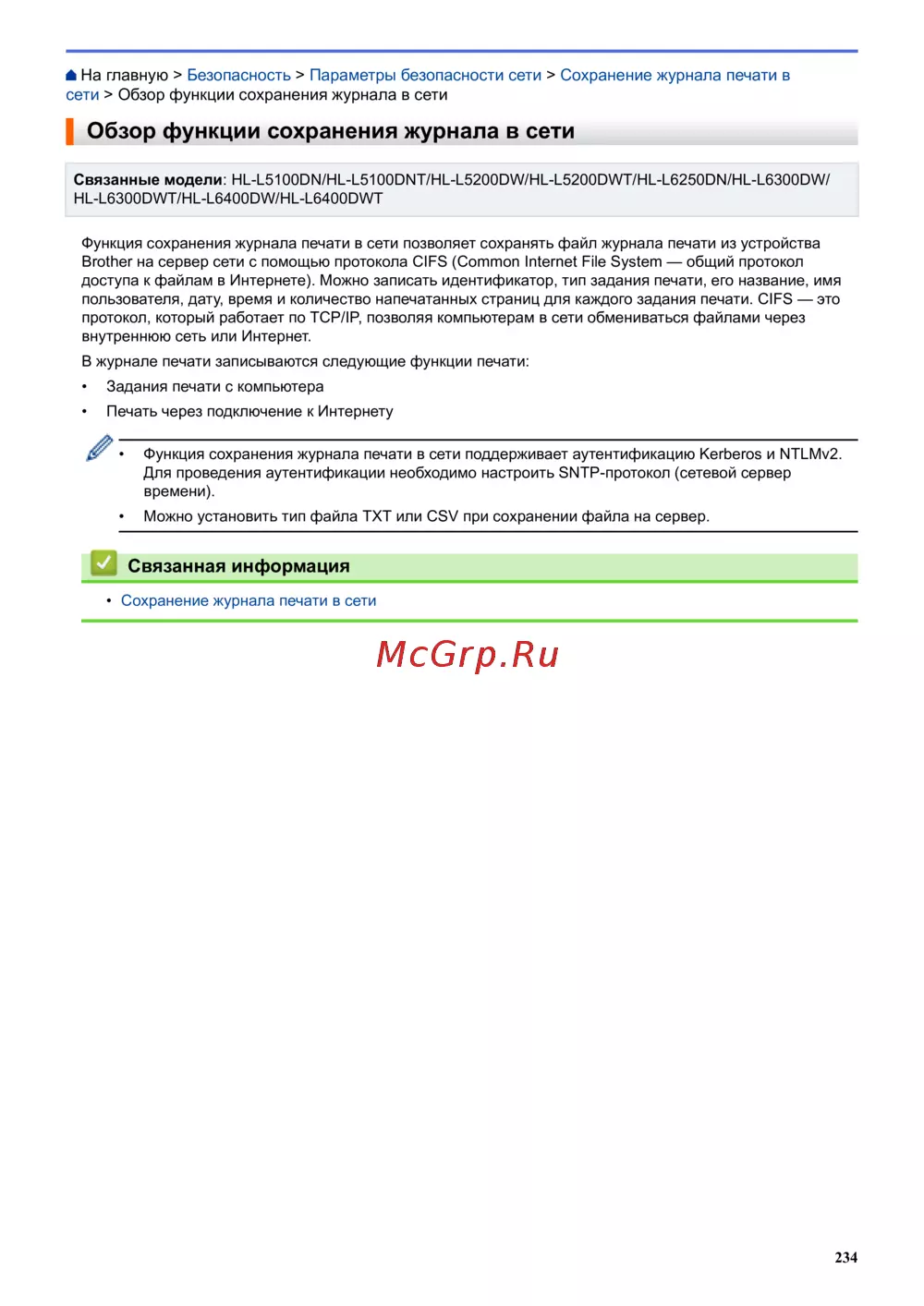 • Функция сохранения журнала печати в сети поддерживает аутентификацию Kerberos и NTLMv2.