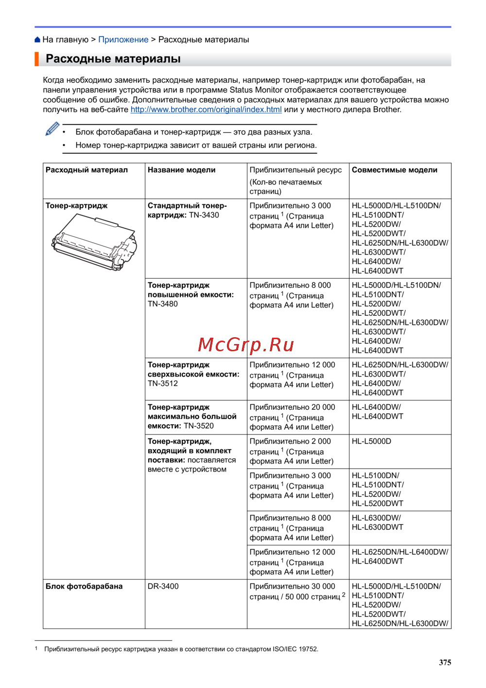 - Доступность аксессуаров зависит от страны или региона дополнительную информацию об аксессуарах для вашего устройства см на веб сайте http www brother com original index html либо обратитесь к дилеру brother или в службу поддержки клиентов p.382