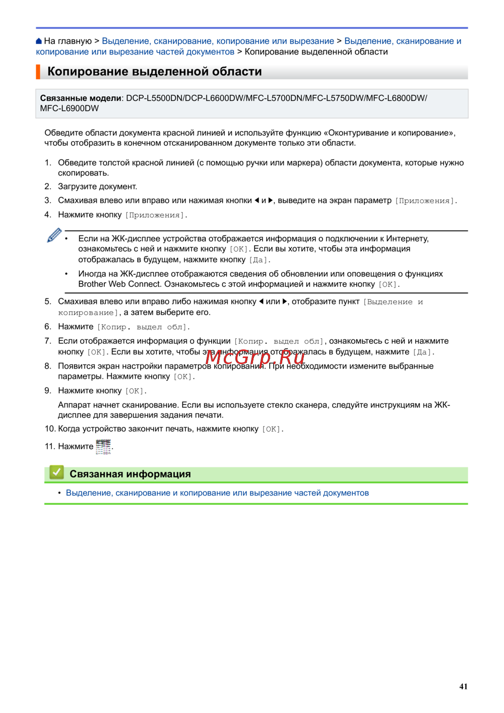 7. Если отображается информация о функции [Копир. выдел обл], ознакомьтесь с ней и нажмите
