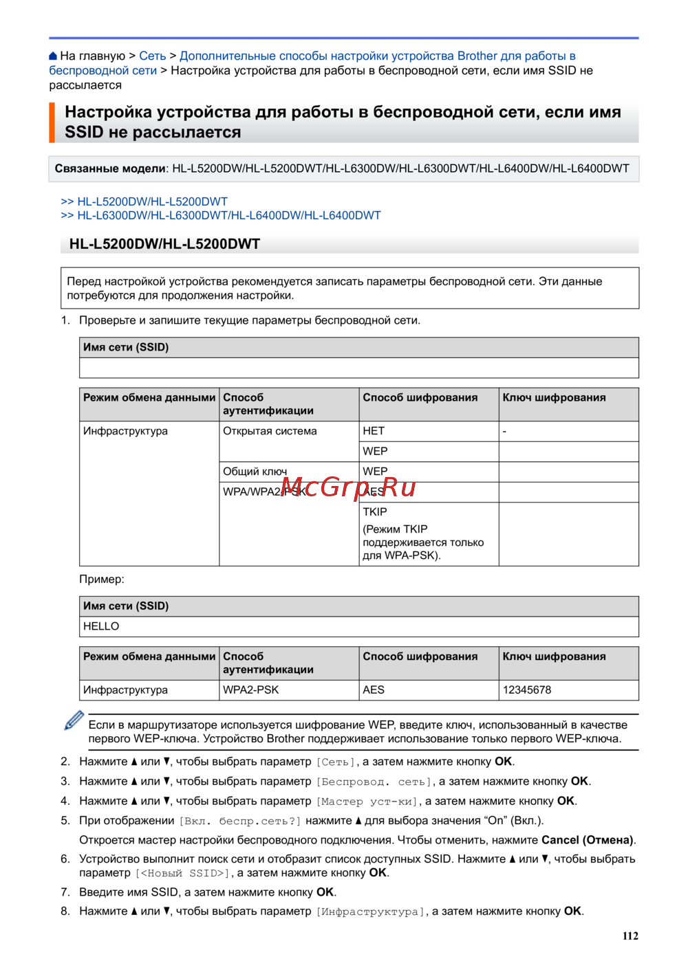 Brother HL-L6400DW [117/407] Настройка устройства для работы в беспроводной сети если имя ssid не рассылается