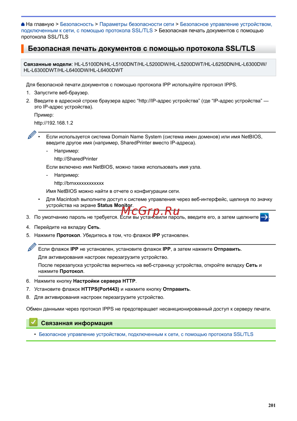 Для безопасной печати документов с помощью протокола IPP используйте протокол IPPS.