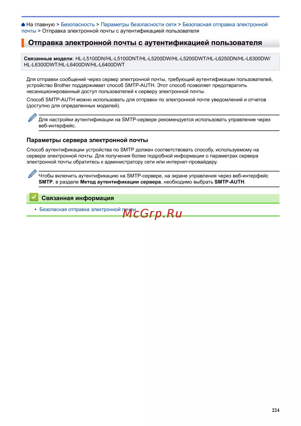 Brother HL-L6400DW — настройка аутентификации для безопасной отправки электронной почты [229/407]