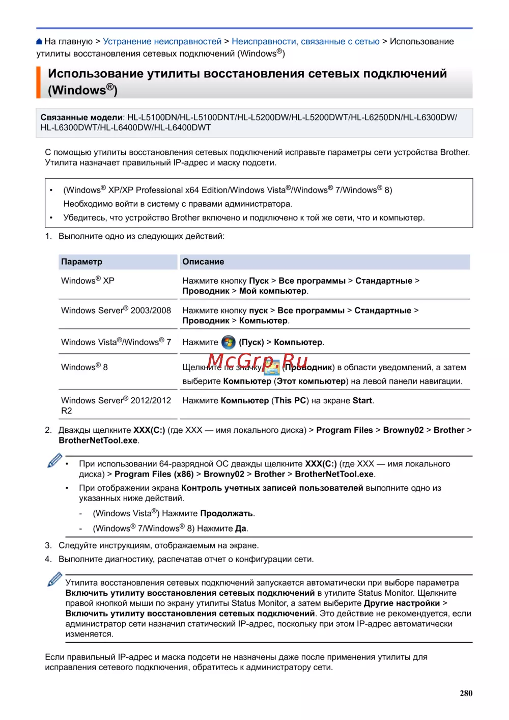 Brother HL-L6400DW [285/407] Использование утилиты восстановления сетевых подключений window