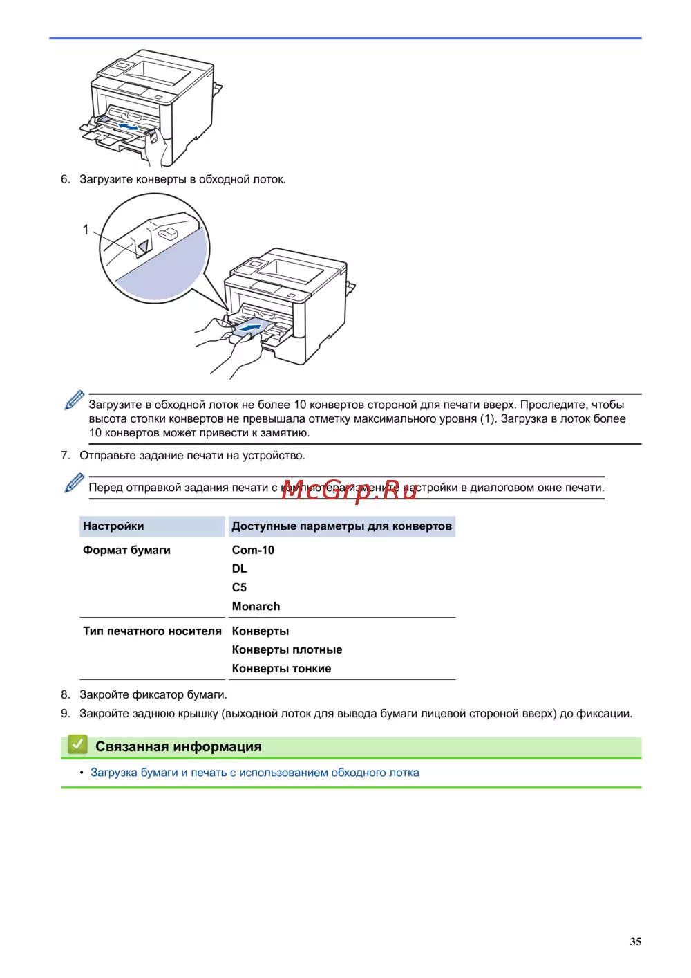 - Загрузка конвертов в обходной лоток и печать на них p.39