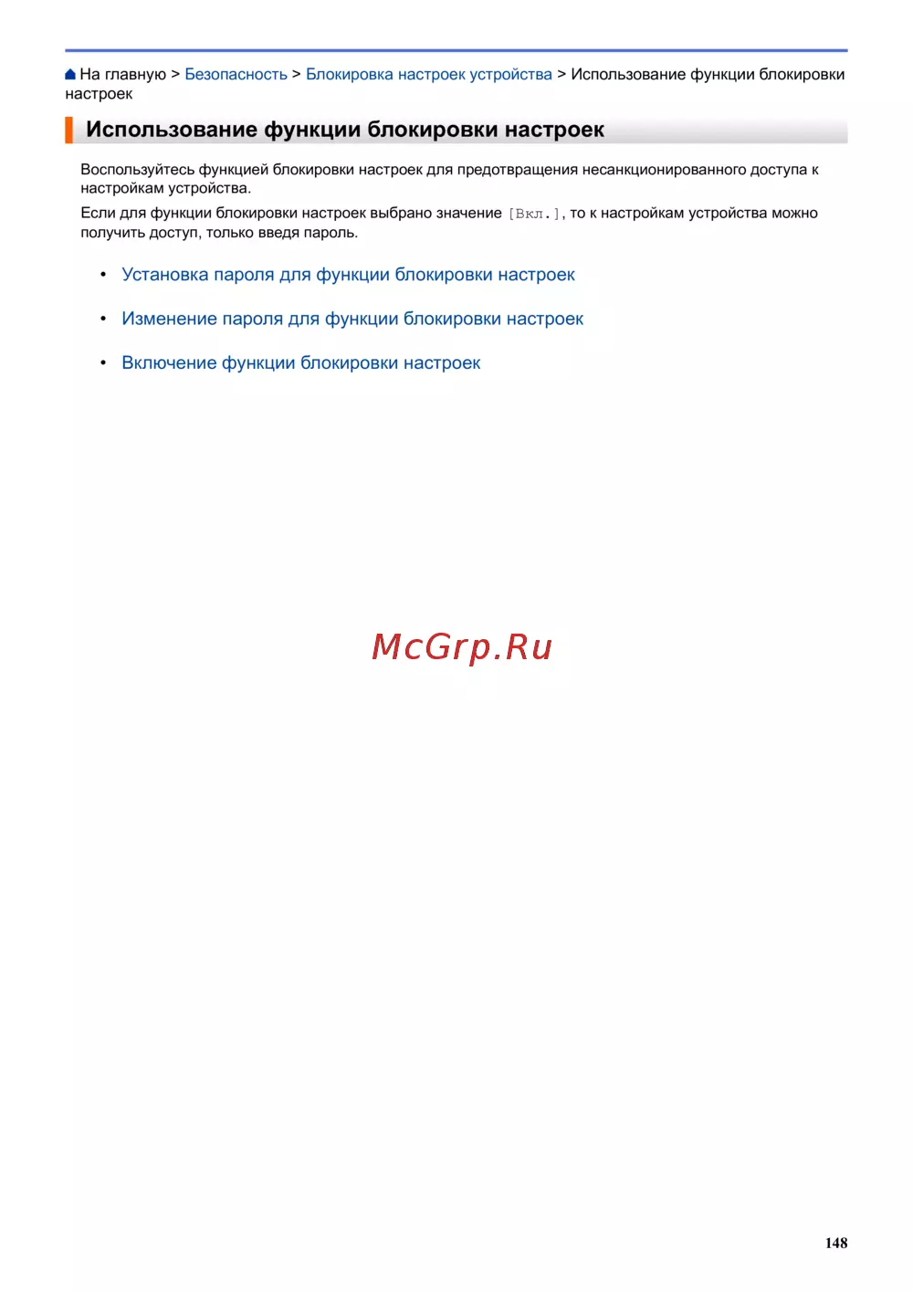 На главную > Безопасность > Блокировка настроек устройства > Использование функции блокировки